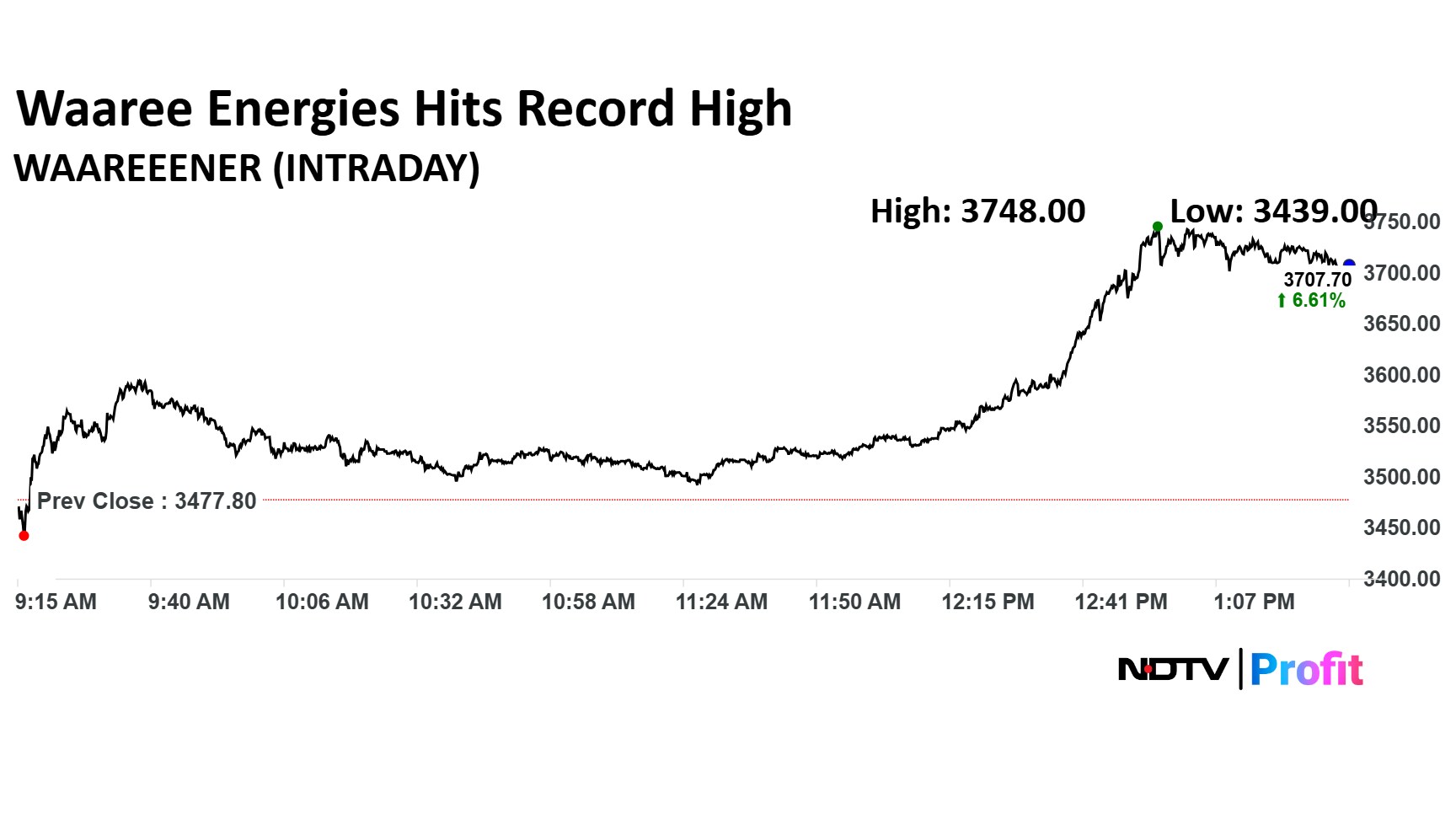 Waaree Energies share price jumped 7.77% to a record high of Rs 3,748 apiece.