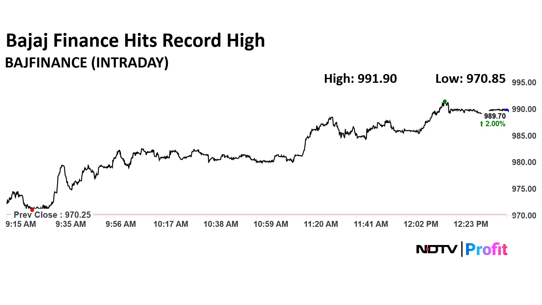 Bajaj Finance share price rose 2.23% to a frsh high of Rs 991.90 apiece. It was trading 2.03% higher at Rs 990.20 apiece as of 12:46 p.m. The company has alloted 1.35 lakh non-convertible debentures.