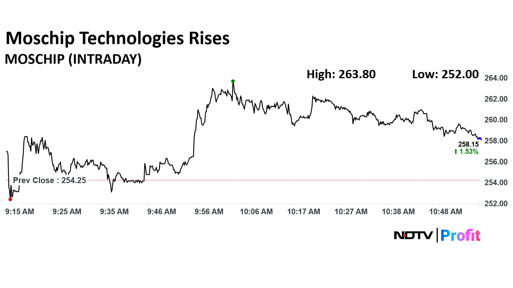 Moschip Technologies share price jumped 3.76% to Rs 263.80 apiece. The stock has been rising for second session as India is set to develop its semiconductor manufacturing industry.