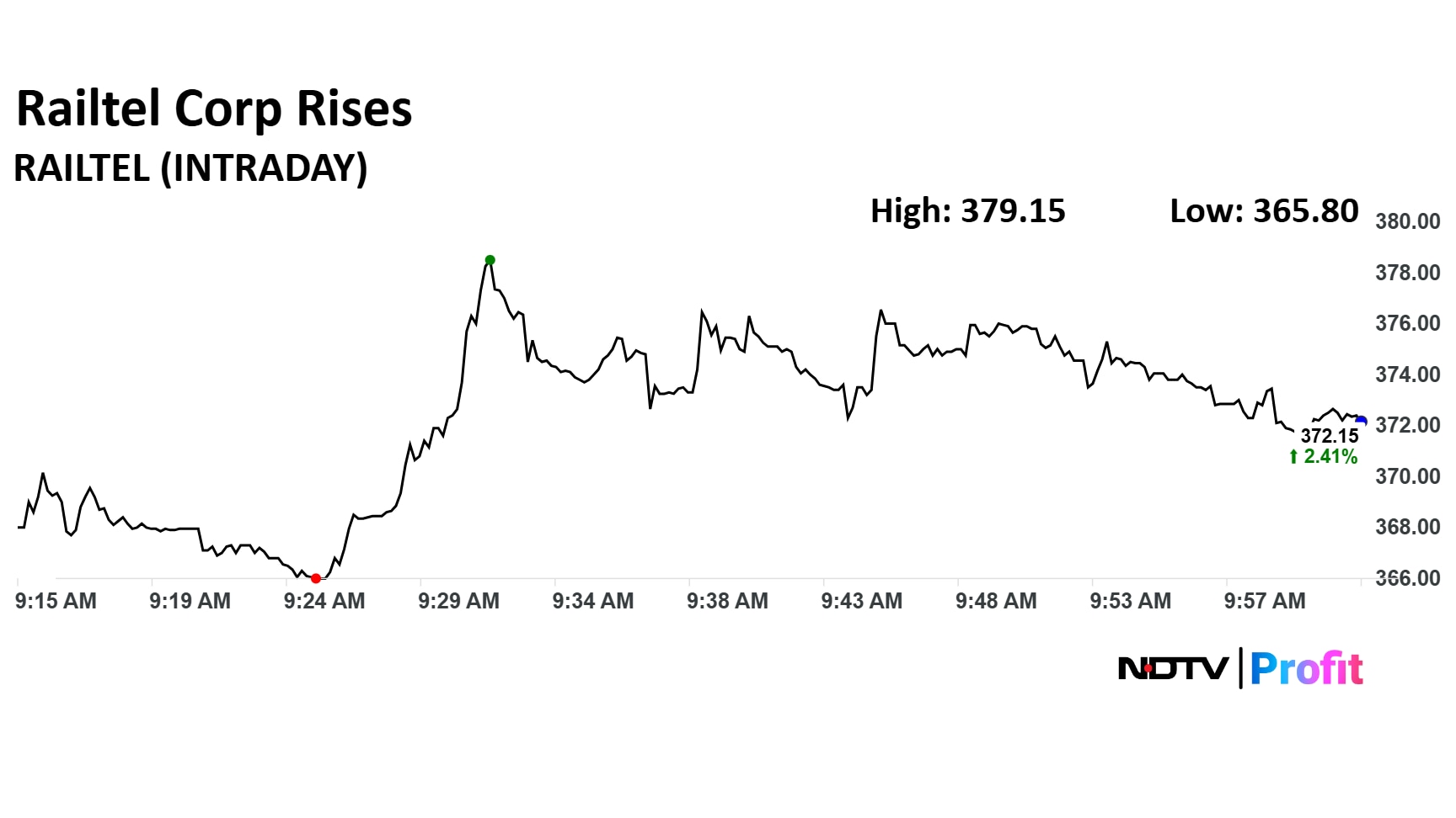Railtel Corp share price rose 4.33% to Rs 379.15 apiece. The company received orders worth Rs 103 crore from Nashik and Panvel municipal corporations.
