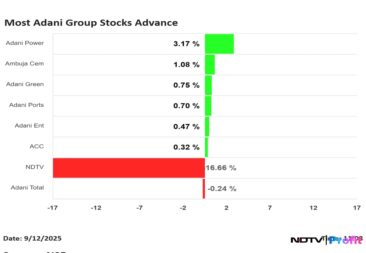 Stocks of most Adani Group stocks advanced with the Adani Power Ltd. share price leading gains. Adani Ports and Special Economic Zone Ltd. and Adani Enterprises Ltd. share prices rose as much as 0.95% and 0.72%, respectively.