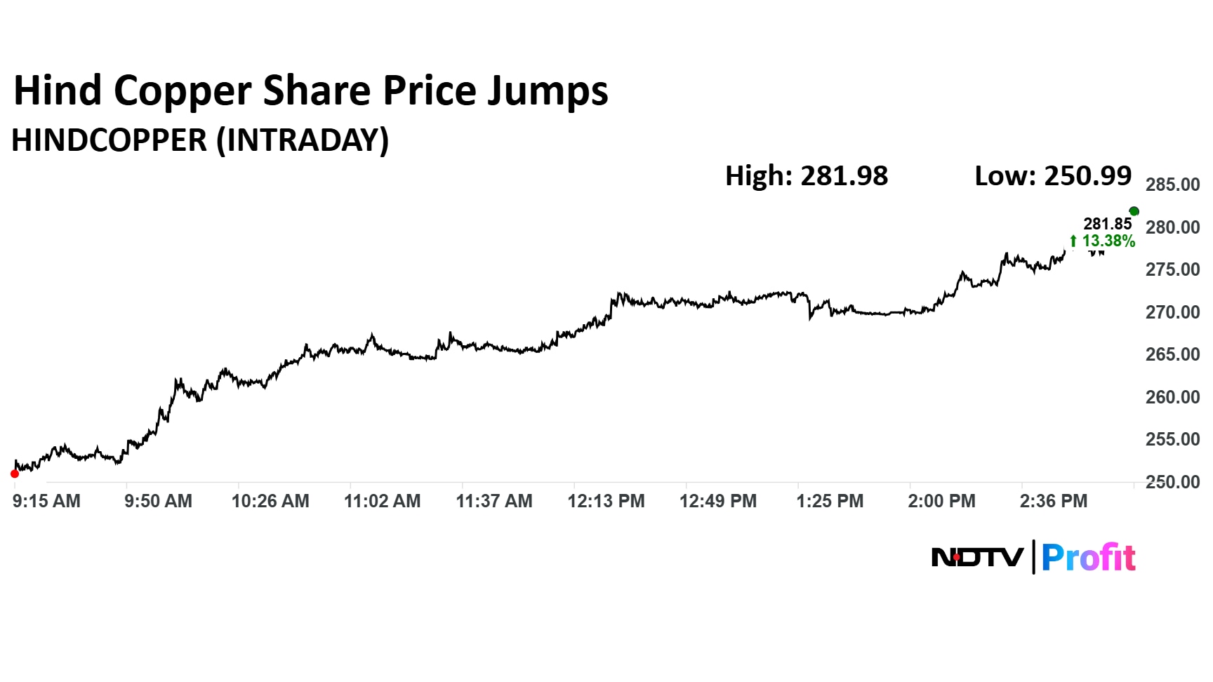 Hindustan Copper Ltd. share price jumped 13.61% to 281.98 apiece, the highest level since July 4. It was trading 12.64% higher at Rs 281.61 apiece. The company has planned Rs 2,000 crore capital expenditure in next five-to-six years.