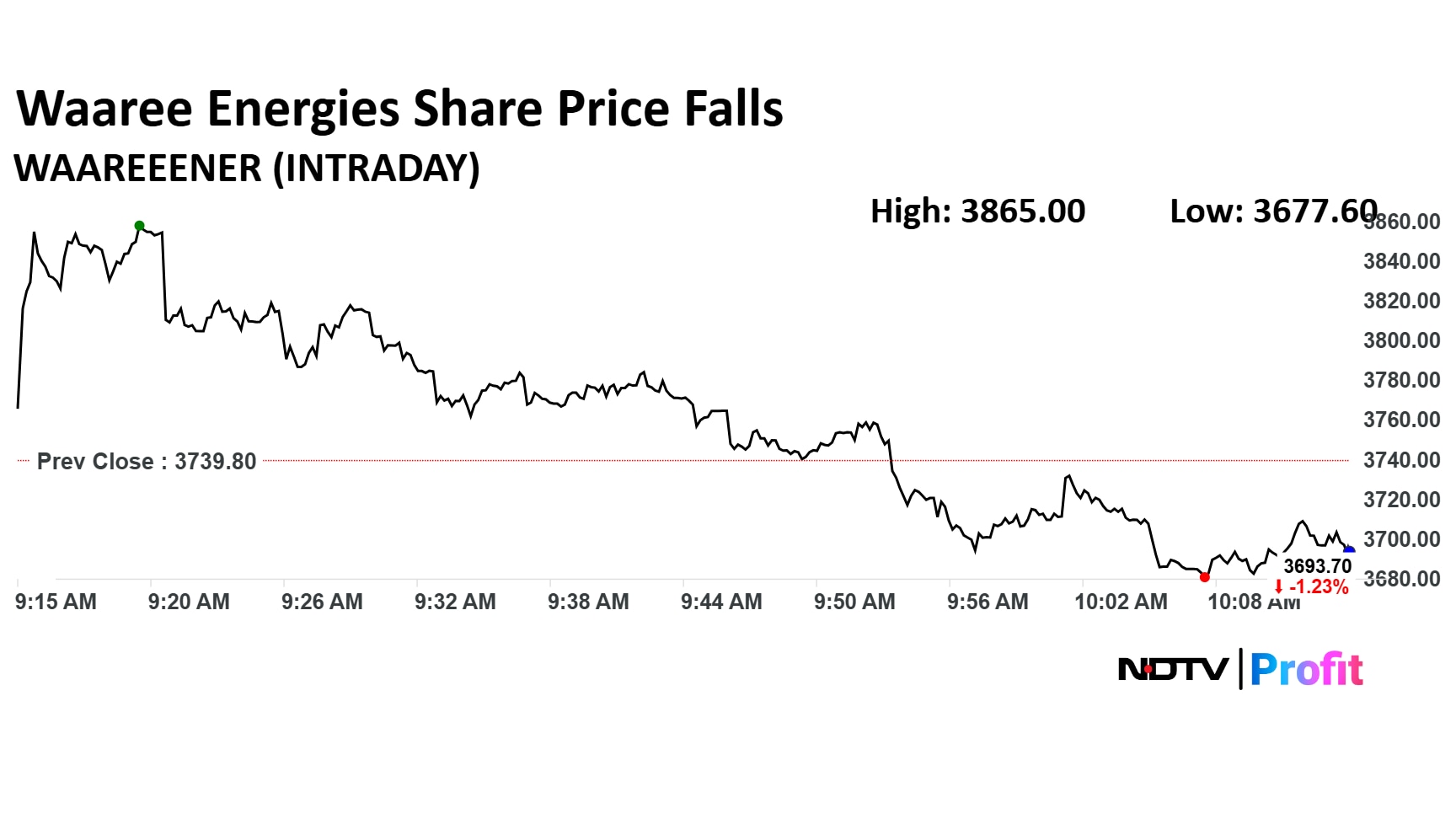 Waaree Energies share price snapped a three-day record rally. The stock price was trading 1.28% down at Rs 3,639 apiece as of 10:15 a.m.