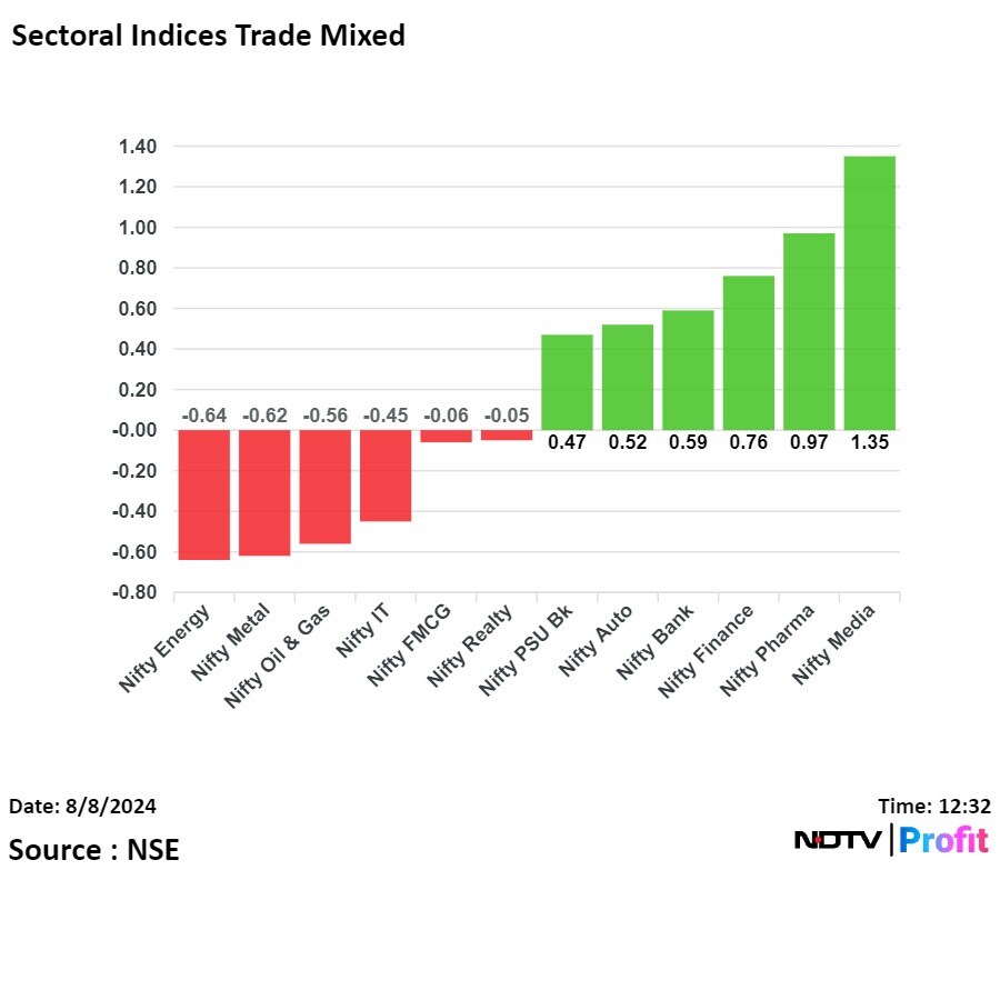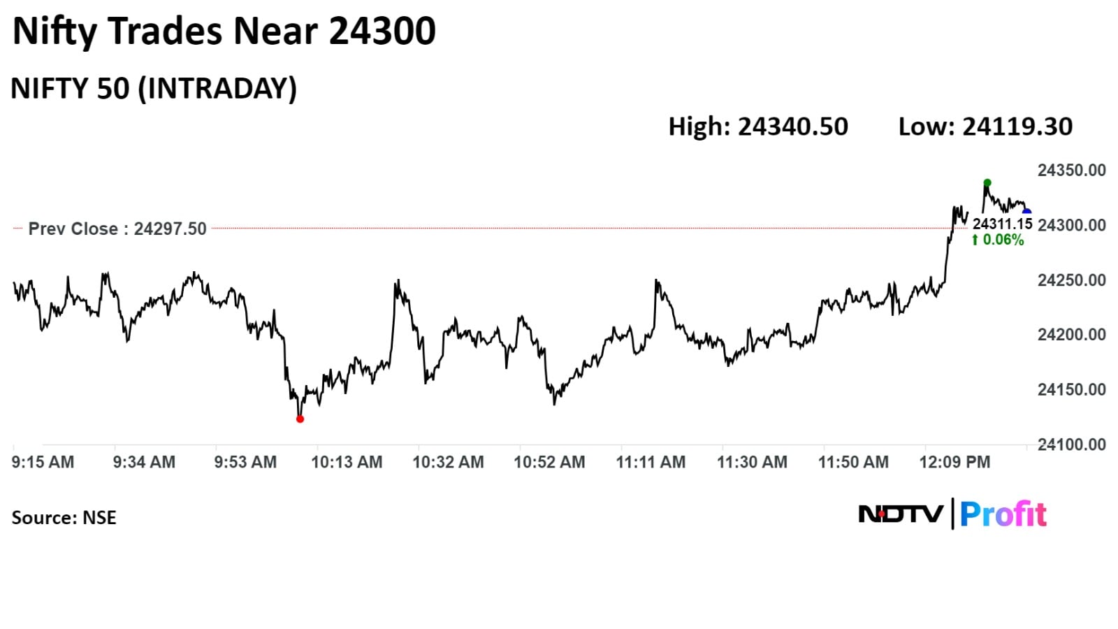 At 12:41 p.m., the NSE Nifty 50 was trading 1.70 points, or 0.01%, lower at 24,295.80, and the BSE Sensex was trading 6.60 points, or 0.01%, higher at 79,474.61. Intraday, Nifty fell as much as 0.73%, and Sensex fell 0.72% during early trade.