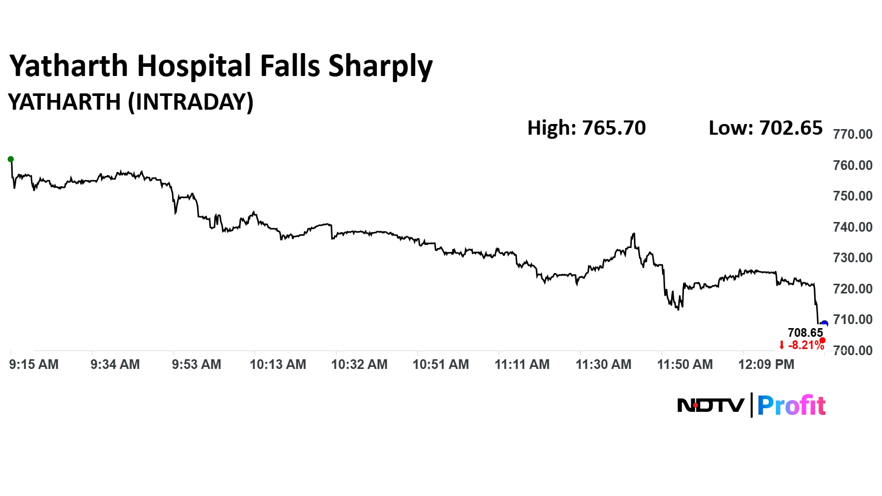Yatharth Hospital And Trauma Care Services share price plunged 8.72% to Rs 704.65 apiece. Its 4.4 lakh shares change hands at Rs 720 apiece via block deal. Sources indicate that promoter has sold stake