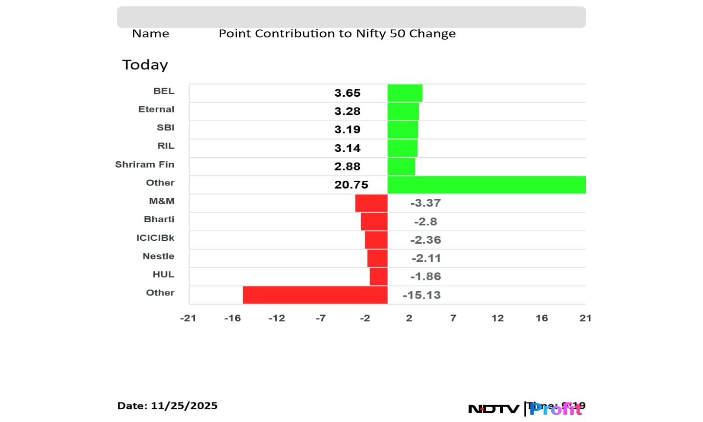 Bharat Electronics Ltd., Eternal Ltd., State Bank of India, Reliance Industries Ltd., and Shriram Finance Ltd. shares limited losses in the Nifty 50 index.