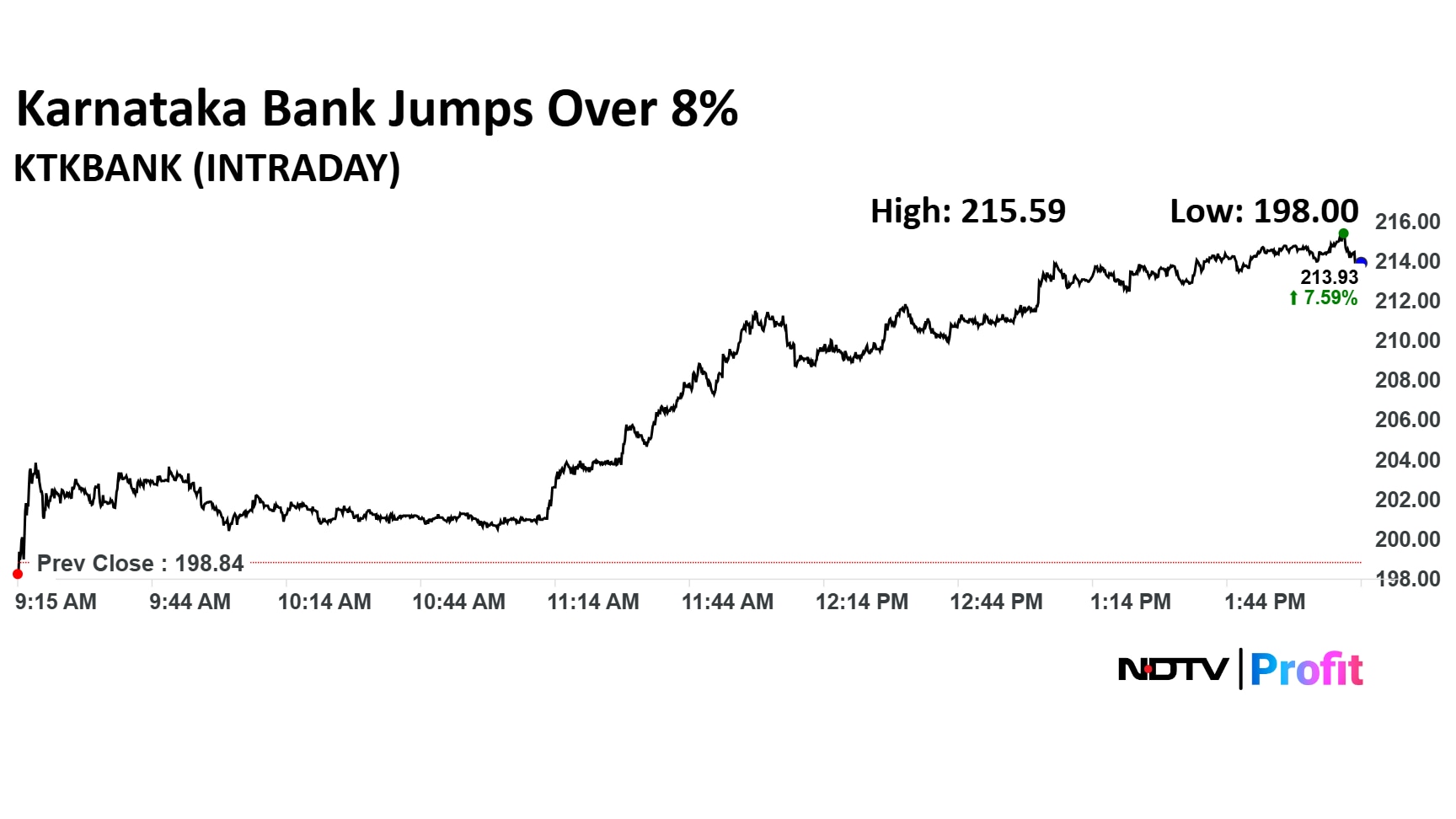 The Karnataka Bank share price jumped 8.42% to Rs 215.59 apiece. It was trading 7.59% higher at Rs 214.13 apiece as of 2:14 p.m.