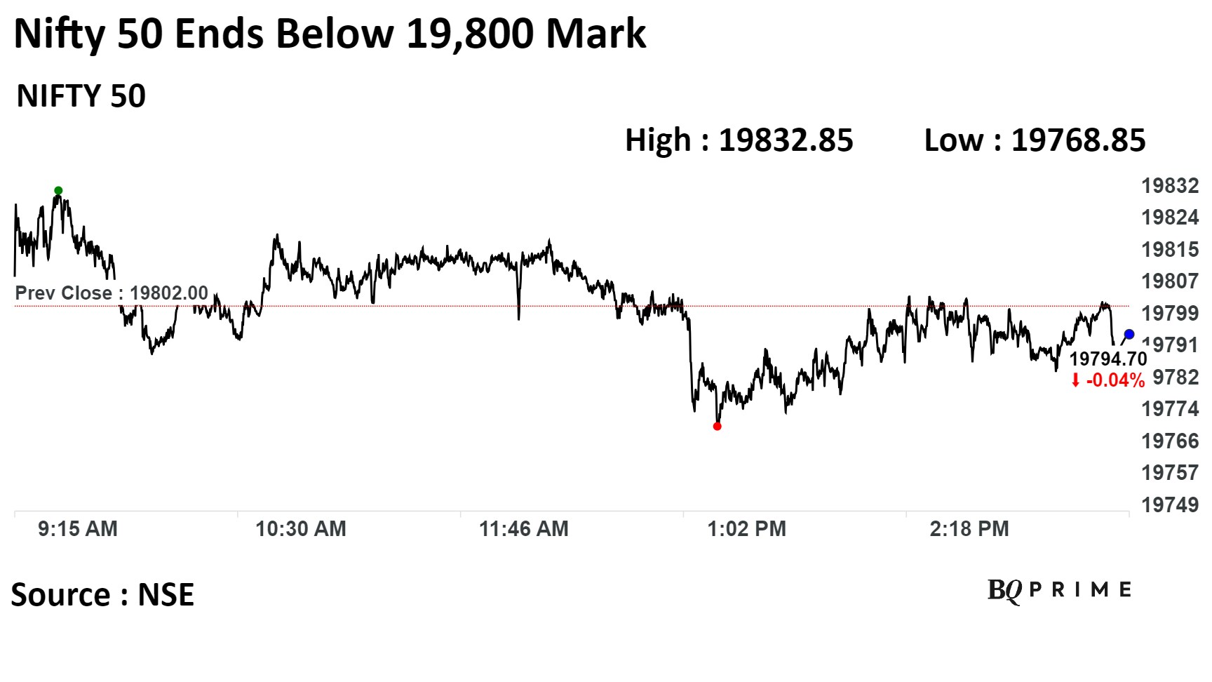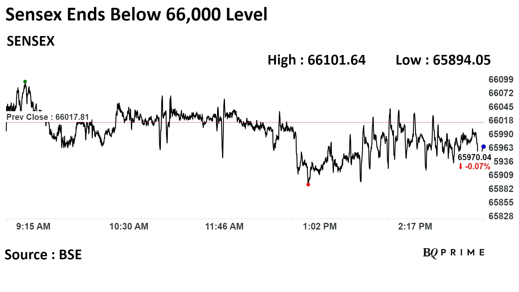 The S&P BSE Sensex ended 5.43 points, or 0.01%, lower at 66,017.81, while the NSE Nifty 50 fell 9.85 points, or 0.05%, to close at 19,802.