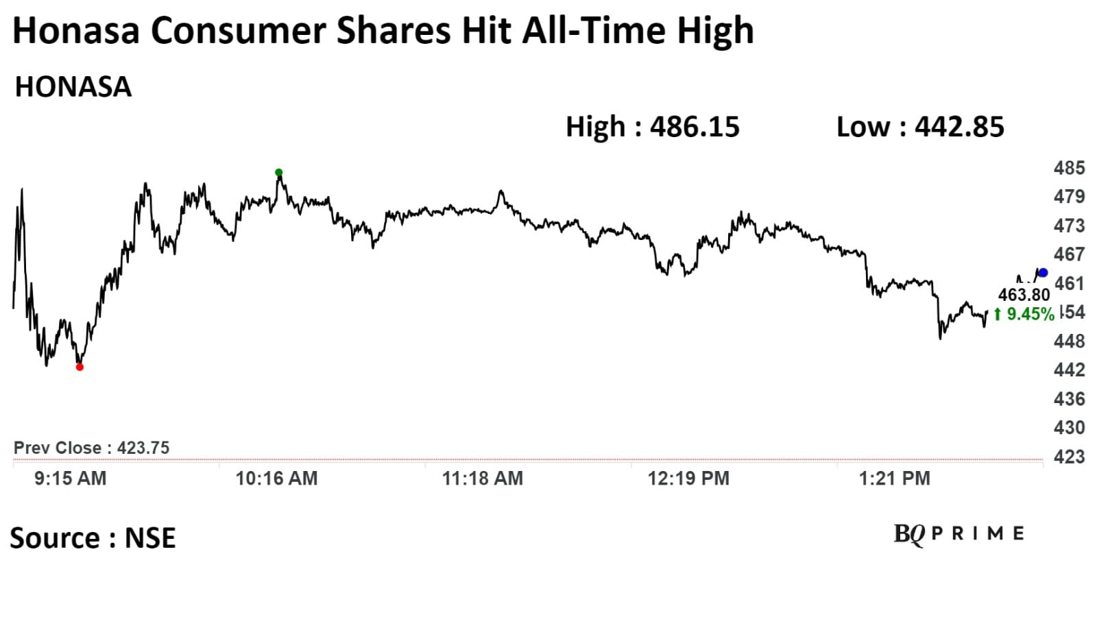 The scrip rose as much as 14% to Rs 486.15 apiece, the highest level since listing. It pared gains to trade 10% higher at Rs 466.10 apiece, as of 2:25 p.m. This compares to a 0.01% decline in the NSE Nifty 50 Index.