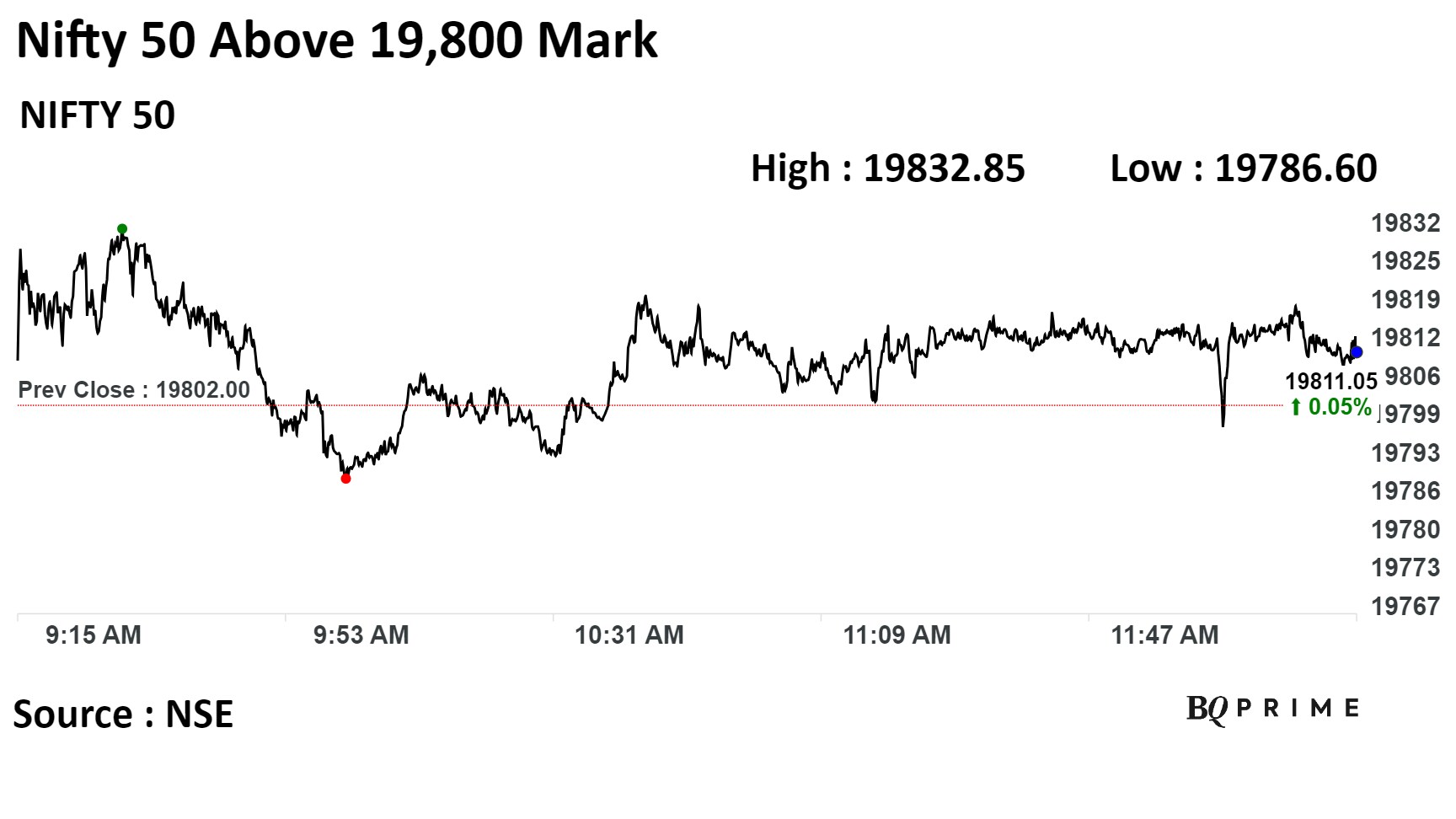 As of 12:27 p.m., the S&P BSE Sensex Index was down 6 points, or 0.01%, at 66,0019.59 while the NSE Nifty 50 was 8 points or 0.04% higher at 19,809.45.