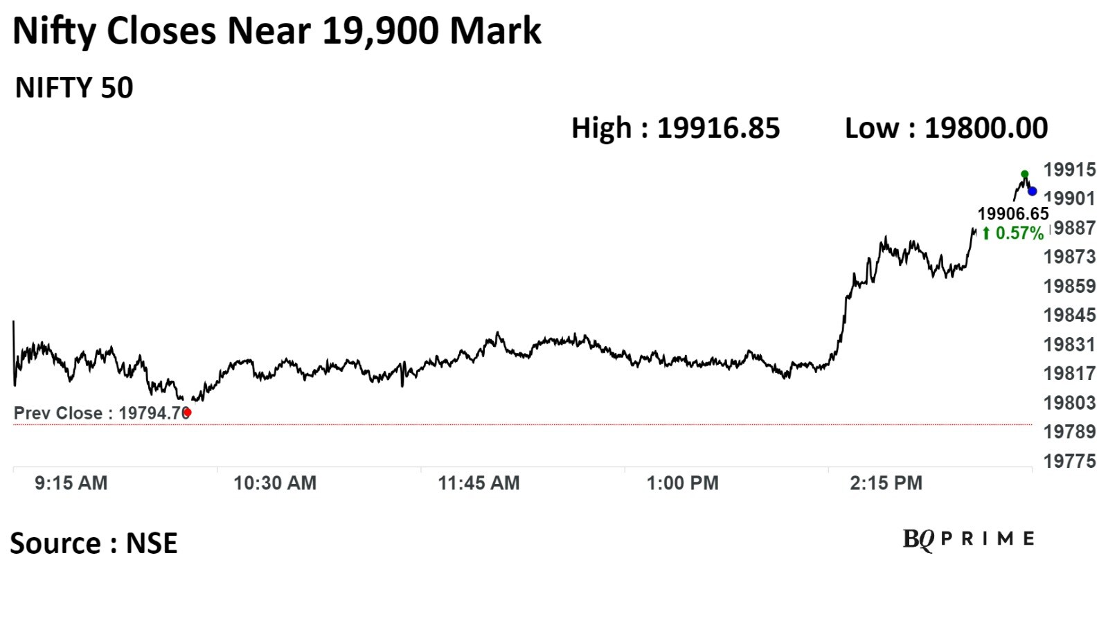 NSE Nifty 50 Index ended just below the 19,900 mark, at its highest level since Sept. 20, whereas Sensex closed above 66,200 level, the highest close since Oct. 17. The S&P BSE Sensex Index closed up 204.16 points, or 0.3%, at 66174.20 while the NSE Nifty 50 was 95 points or 0.48% higher at 19,889.70.
