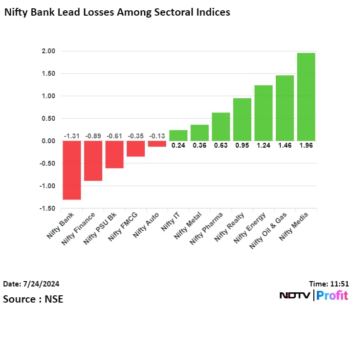 On NSE, five out of 12 sectors declined, and seven advanced. The NSE Nifty Bank declined the most, and the NSE Nifty Media rose the most.