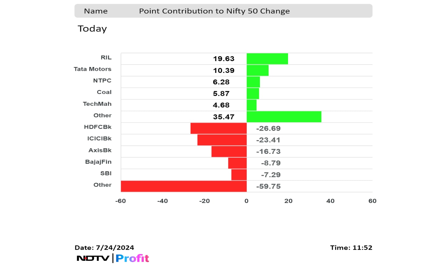Shares of Reliance Industries Ltd., Tata Motors Ltd., NTPC Ltd., Coal India Ltd., and Tech Mahindra Ltd. limited loss in the Nifty.