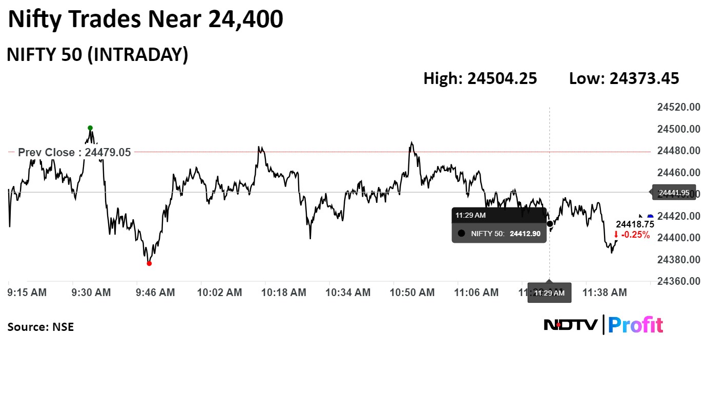 As of 12:00 p.m., the NSE Nifty 50 was trading 81.90 points, or 0.33% lower at 24,397.15, and the S&P BSE Sensex was trading down 340.31 points, or 0.42% at 80,088.73.