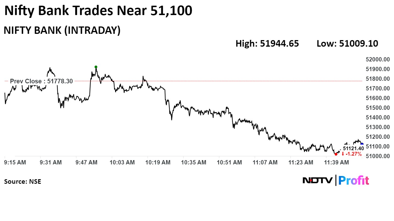 Indian stock benchmark indices continued to trade in negative through midday tracking decline in the shares of HDFC Bank Ltd. and ICICI Bank Ltd., while investors assess the impact of budget for financial year 2025, announced on Tuesday.