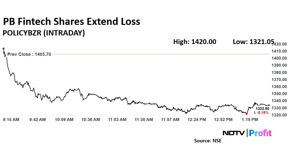 Shares of PB Fintech Ltd., the parent of insurance aggregator PolicyBazaar, were down over 5% on Thursday, thereby extending the losses over the past two days to nearly 10%.