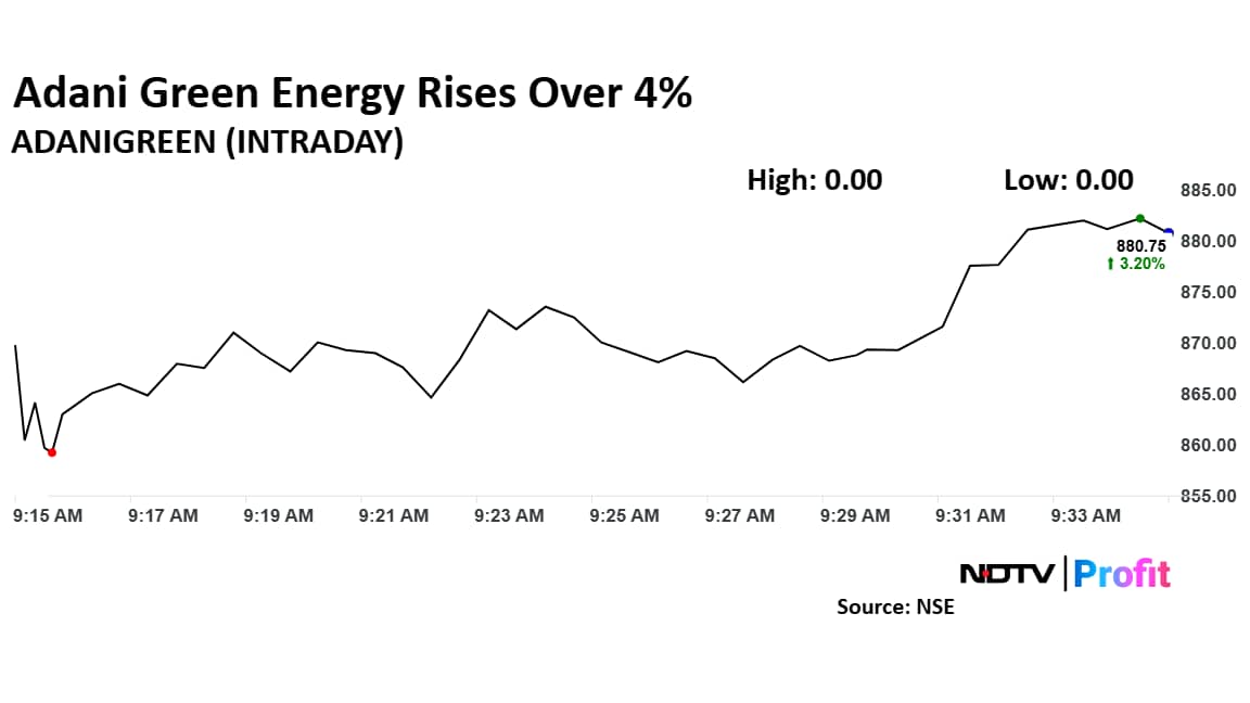 Adani Green Energy shares rose over 4% on Thursday. The shares of Adani Green Energy were trading 3.50% up at Rs 883.35 per share. This comes after Macquarie Equity Research initiated an Outperform rating for Adani Green Energy with a scenario-weighted target price of Rs 1,200, and a bull-case target price of Rs 2,600 if the company successfully meets its targets. The bull case implies a 200% upside from the current level.