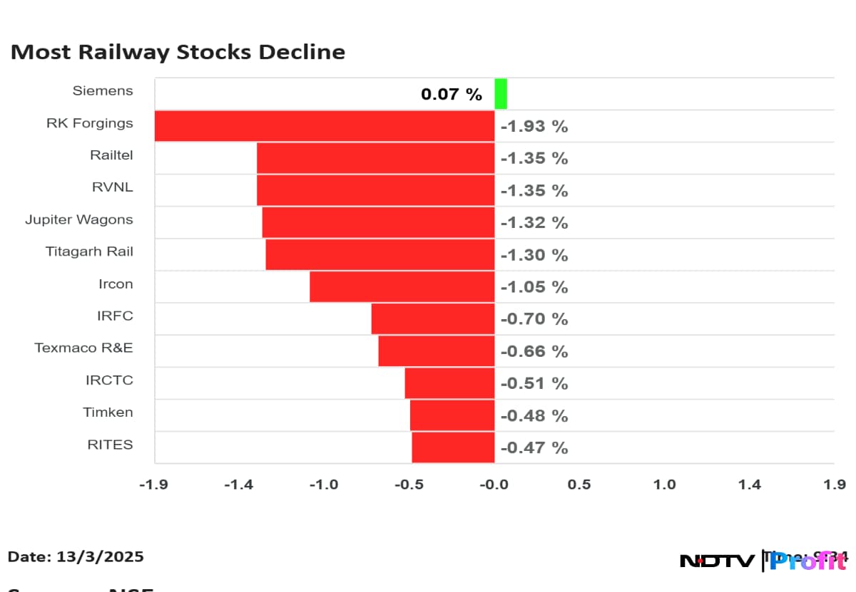 Most railway stocks decline on Thursday with RK Forgings leading the fall. Railtel and RVNL were also among the draggers. On the other hand, Siemens was in the green.