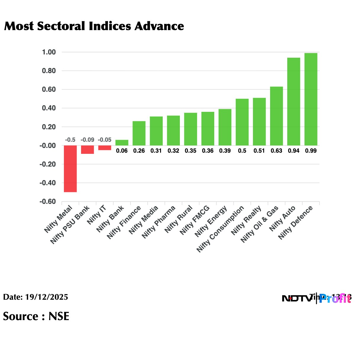 Sectoral indices were largely trading in the green, led by Nifty Defence and Auto.