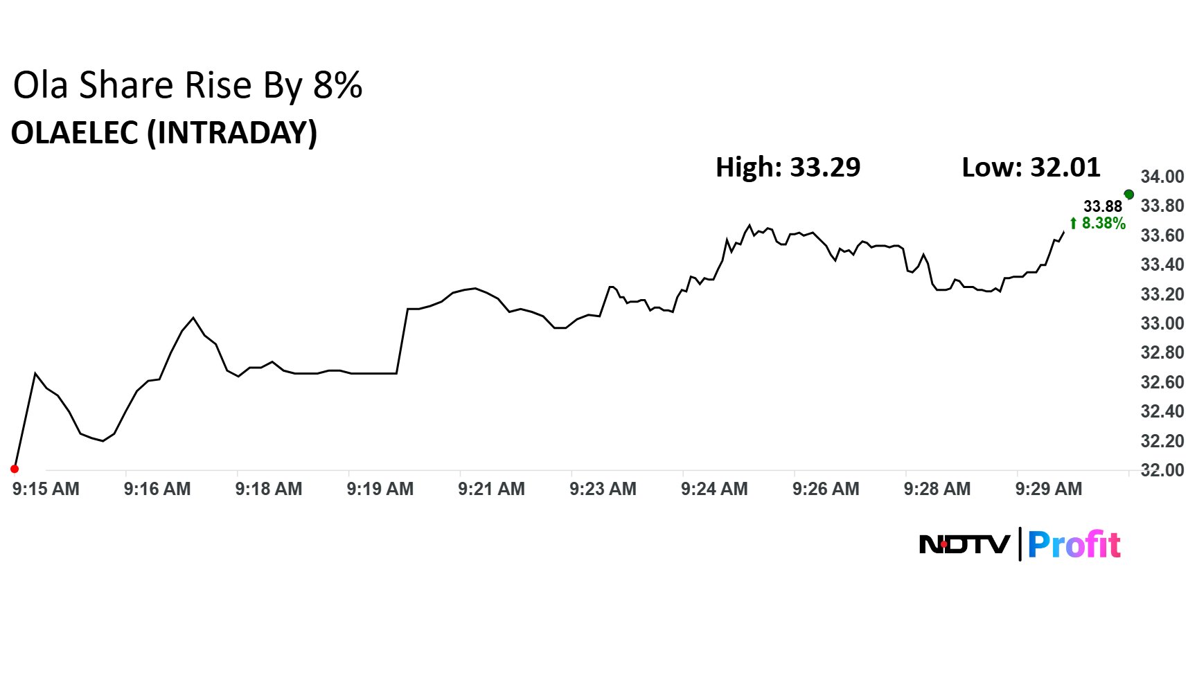Shares of Ola Electric Mobility Ltd. picked up pace as it rose by 8% at Rs 33.88 a piece. The stock closed at 31.26 on Thursday and quickly grew as the markets opened on Friday.