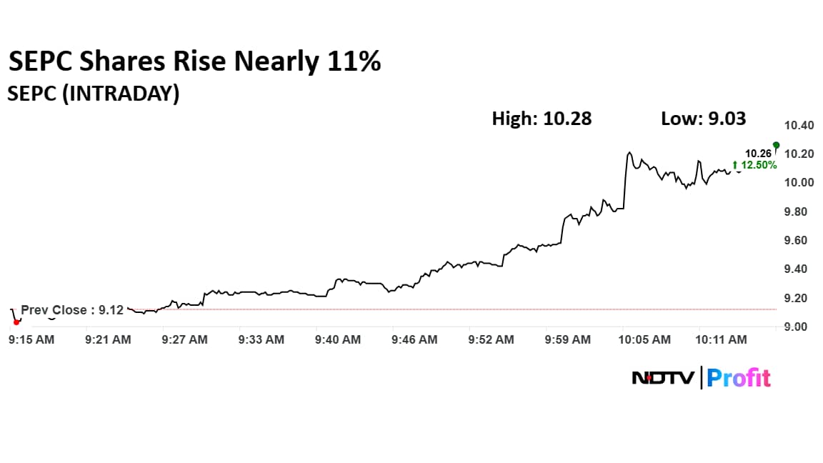 SEPC shares have risen nearly 11% on Monday after the company secures entry into Rs 3,300 crore Mining Consortium Project in Madhya Pradesh. The MoU was awarded by South Eastern Coalfields