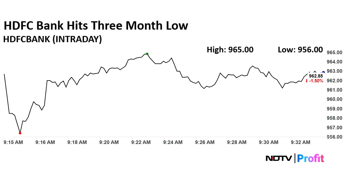 Emmvee Photovoltaic Shares Surge As Jefferies Initiates First Buy Call — Here's WhyThe shares of HDFC Bank on Tuesday fell to hit three-month low. The scrip fell as much as 2.20% to Rs 956 apiece on Tuesday, the lowest level since Oct. 3. It pared gains to trade 1.50% lower at Rs 962.85 apiece, as of 9:37 a.m. This compares to a 0.16% decline in the NSE Nifty 50 Index.