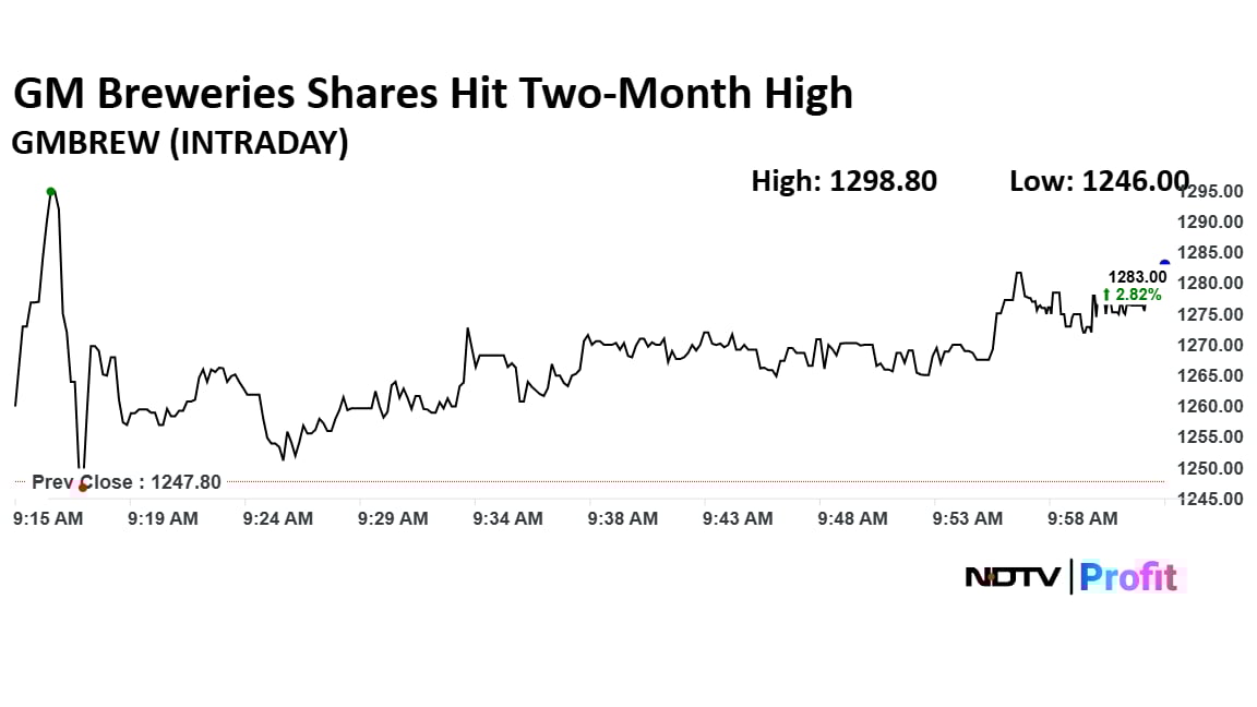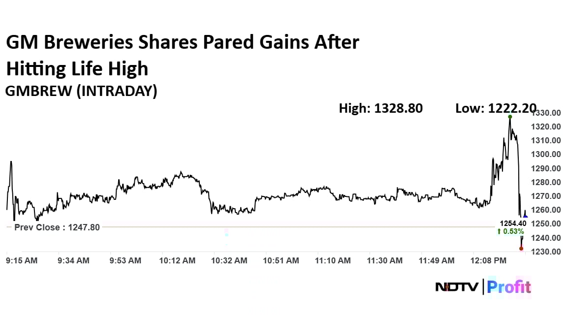 The shares of GM Breweries rose as much as 6.49% to Rs 1,328.80 apiece on Tuesday, hitting fresh life high. However, it pared gains to trade 1% lower at Rs 1,236.20 apiece, as of 12:30 p.m. This compares to a 0.35% decline in the NSE Nifty 50 Index.