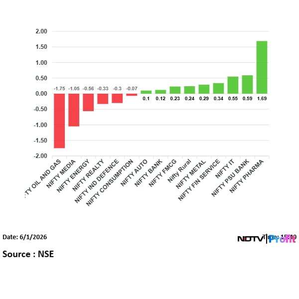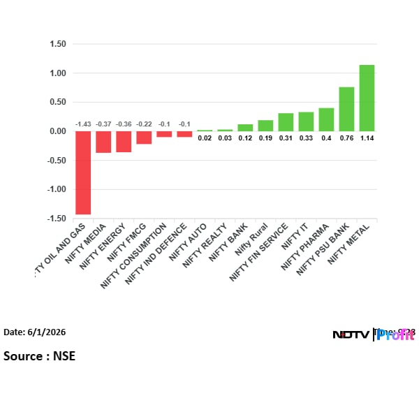 Most sectoral indices fell, led by Nifty oil and gas and Nifty media. Nifty PSU Bank and Nifty Metal were trading higher.