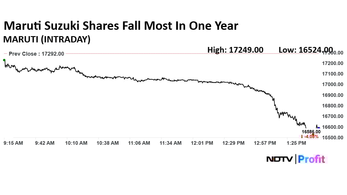 Maruti Suzuki shares fall the most since February 2025. The shares fell over 4% to Rs 16,524 per share.