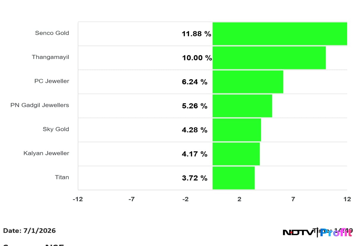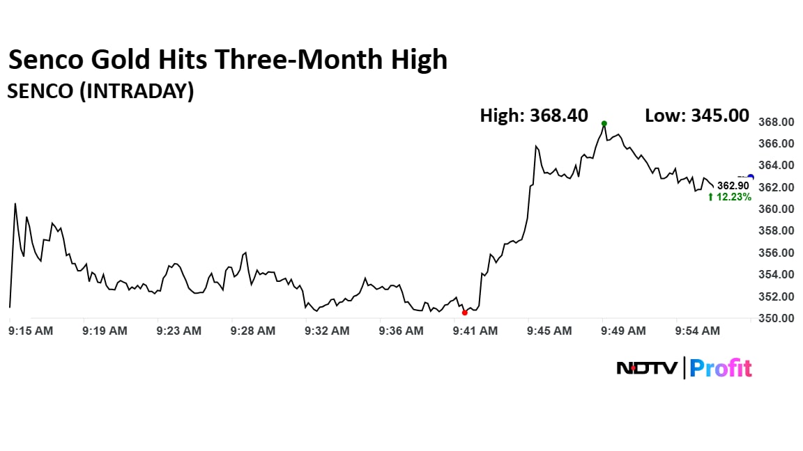 The shares of Senco Gold rose as much as 13.93% to Rs 368.40 apiece on Wednesday, highest level since Sept. 23. It pared gains to trade 11.89% higher at Rs 361.80 apiece, as of 9:56 a.m. This compares to a 0.24% decline in the NSE Nifty 50 Index.