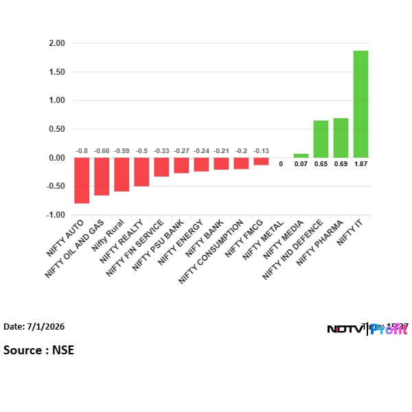 Most sectoral indices fell with Nifty Auto and Nifty Oil And Gas leading the decline, while Nifty IT and Nifty Pharma were among the gainers.