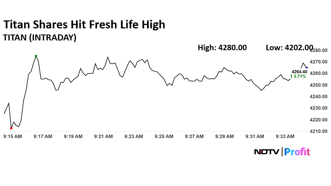 Meesho Shares Stuck In Lower Circuit As Shareholder Lock-In Expires Titan shares rose as much as 4.09% to Rs 4,280 apiece on Wednesday, hitting fresh life high. It pared gains to trade 3.31% higher at Rs 4,248 apiece, as of 9:39 a.m. This compares to a 0.08% decline in the NSE Nifty 50 Index.