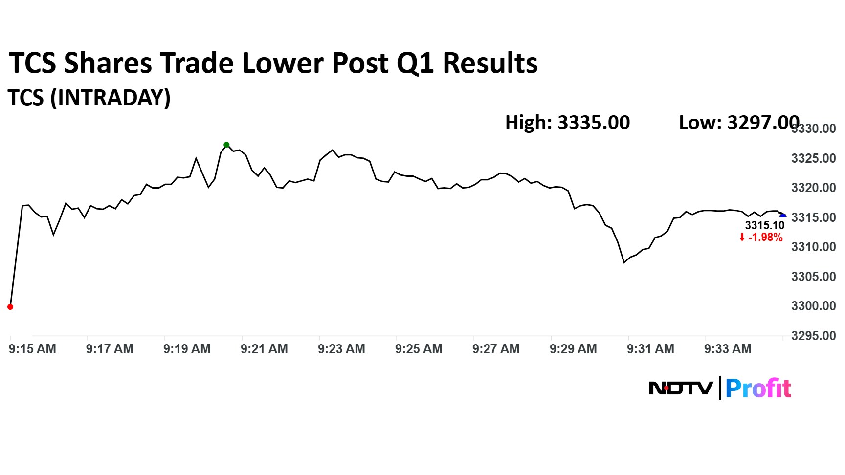 The shares of TCS has slipped lower, dragging the benchmark index Nifty 50 after posting its first quarter results. The scrip was trading 1.81% lower at Rs 3,382 compared to a 0.21% decline in the Nifty 50 as of 9:37 a.m.