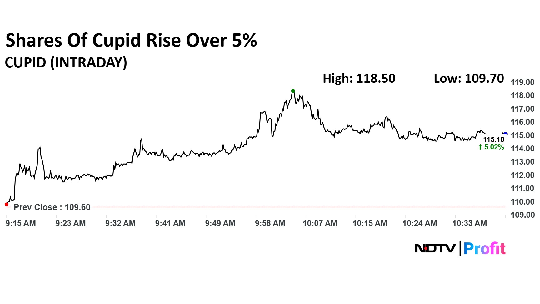 The shares of Cupid rose over 5% during trade so far, trading 6.87% higher at Rs 117 apiece on the NSE. This rise compares to a 0.58% decline in the benchmark index Nifty 50 as of 10:44 a.m.