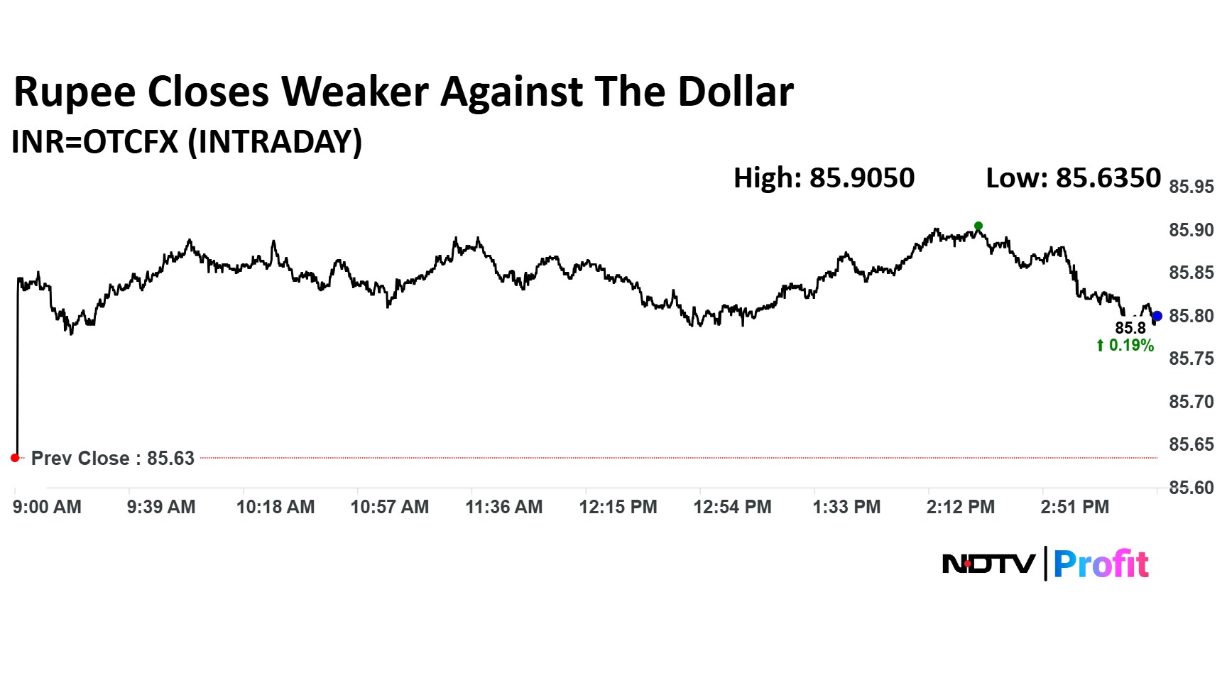 Rupee closed 16 paise weaker against US dollar at 85.80. For the week, the local currency fell 0.5%, according to Bloomberg data.