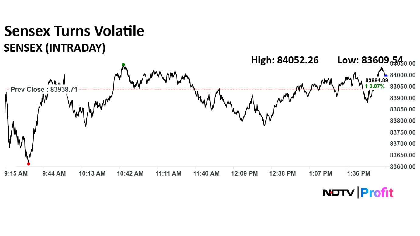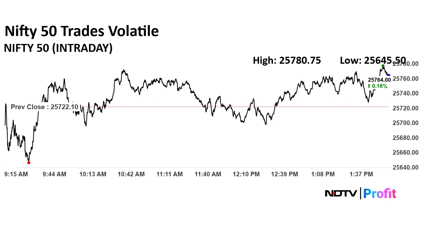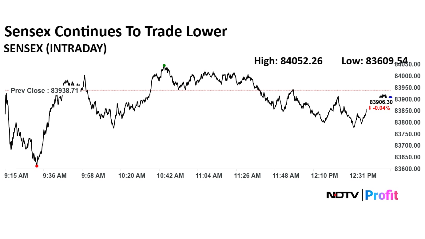 Benchmark indices Nifty 50 and Sensex were trading lower at noon. Nifty 50 was down 0.08% at 25,702.20 and Sensex was trading 0.16% lower at 83,807.89 mark.