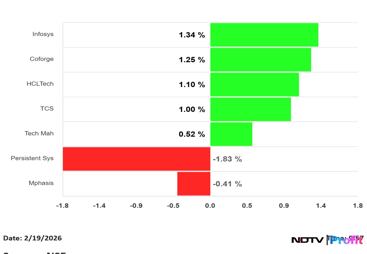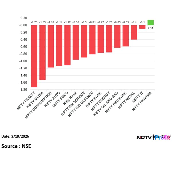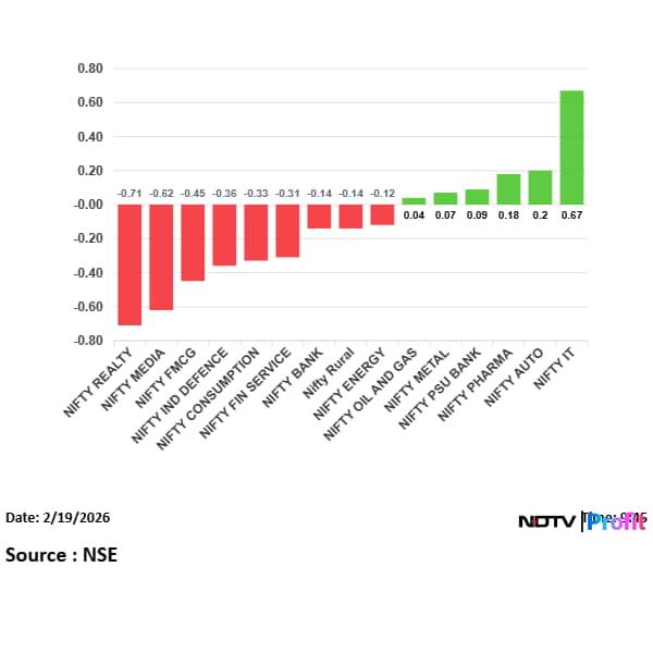 Thirteen out of 15 sectoral gauges compiled by the NSE traded lower, led by the NSE Nifty Realty Index's 1.5% fall. On the flipside, the NSE Nifty IT Index was the top sectoral gainer, up 0.4%.