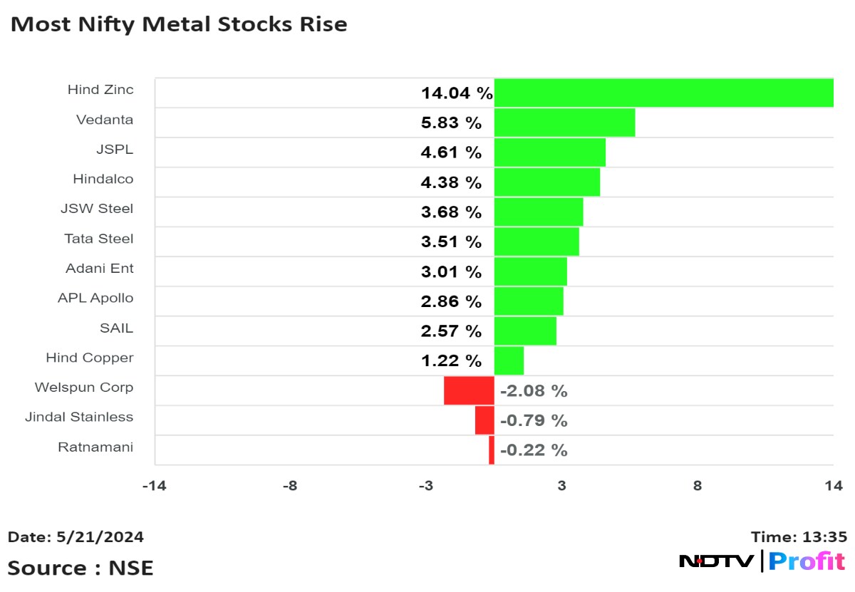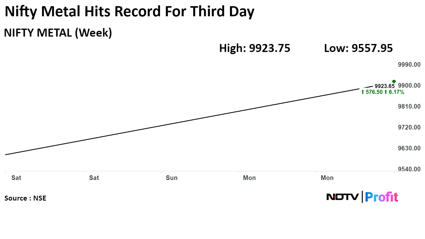 The NSE Nifty Metal index ros 3.07% to 9,903.80,the highest level since its incorporation on July 12, 2011. It was trading 3.05% higher at 9,901.0 as of 12:17 p.m., as compared to 0.20% advance in the NSE Nifty 50 index.