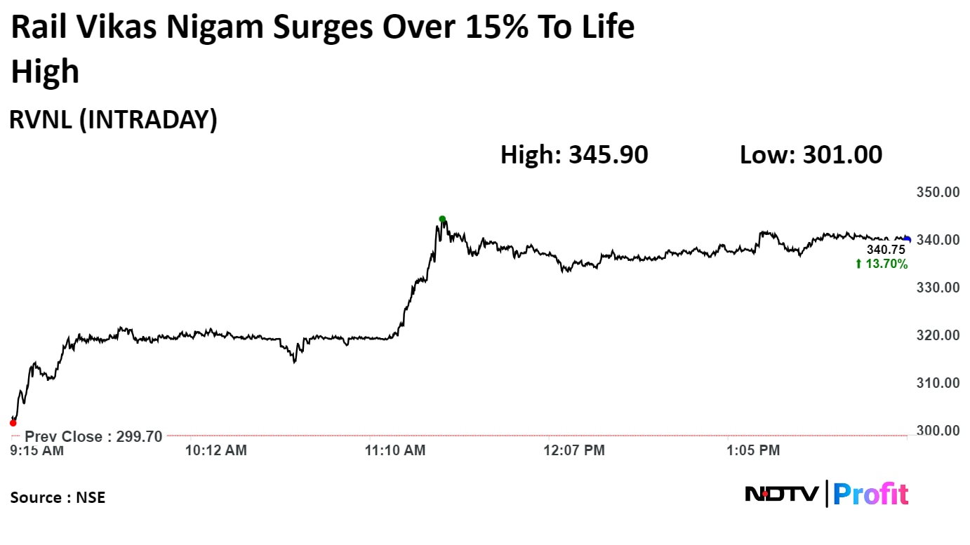 Shares of Rail Vikas Nigam Ltd. surged 15.42% to 345.90, the highest level since its listing on April 11, 2019. It was trading 13.05% higher at Rs 338.80 as of 2:17 p.m., as compared to 0.17% advance in the NSE Nifty 50 index.