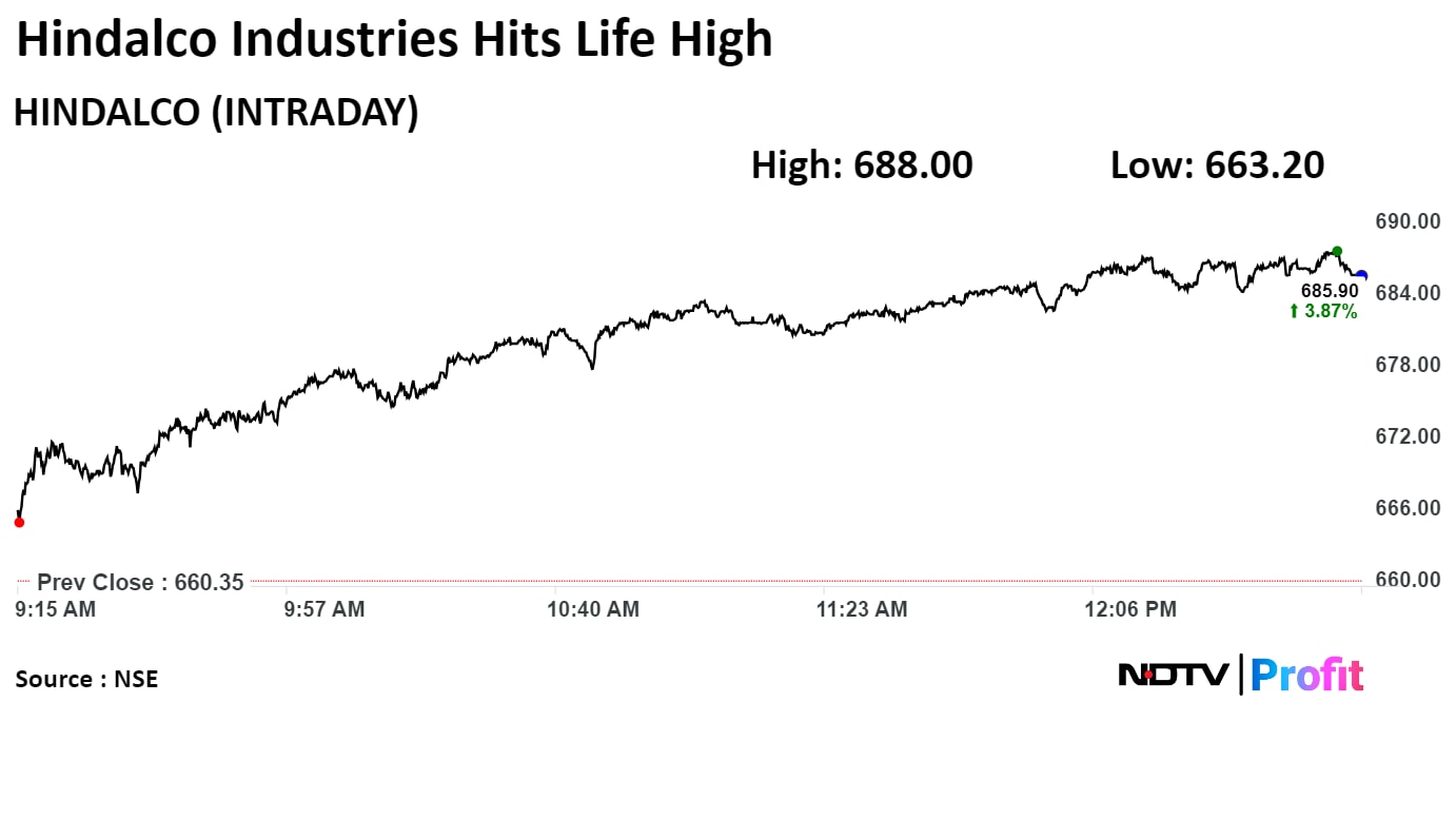 Shares of Hindalco Industries Ltd. rose 4.19% to Rs 688.00, the highest level since its listing on Jan 8, 1997. It was trading 3.88% higher at Rs 686.00 as of 12:50 p.m., as compared to 0.27% advance in the NSE Nifty 50 index.