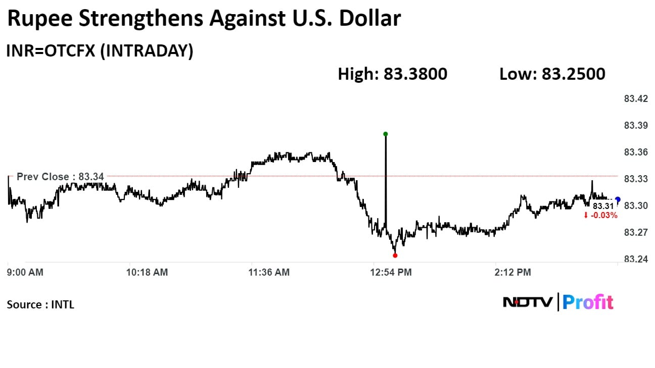 • The local currency strengthened by 2 paise to close at 83.31 against the U.S dollar.