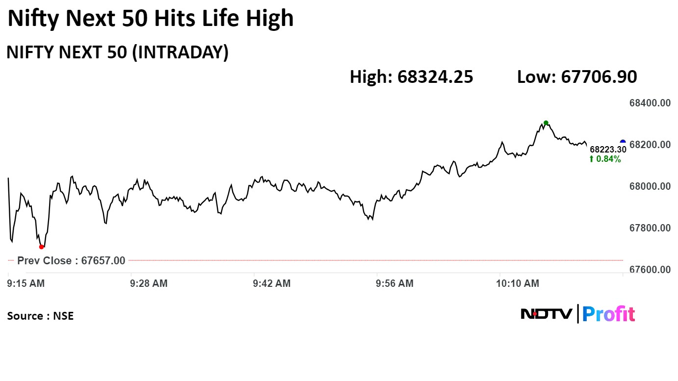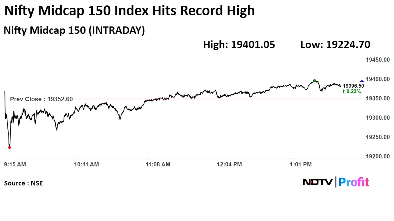 The NSE Nifty Midcap 150 rose 0.25% to 19,401.05, the highest level since its inception. It was trading 0.22% higher at 19,394.35 as of 1:59 p.m., as compared to 0.18% advance in the NSE Nifty index.