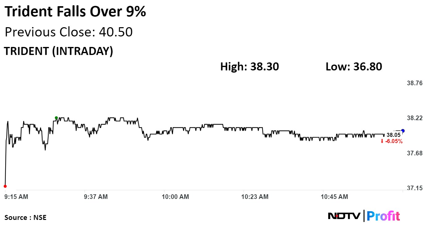 Shares of Trident Ltd. declined 9.14% to Rs 36.80, the lowest level since May 10. It pared losses to trade 6.17% down at Rs 38.00 as of 11:05 a.m., as compared to 0.01% decline in the NSE Nifty 50 index.