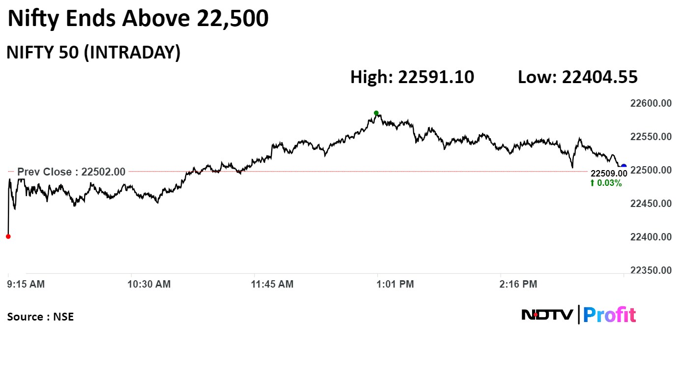 The S&P BSE Sensex closed 88.91 points, or 0.12% higher, at 71,005.94, while the NSE Nifty 50 advanced 35.9 points, or 0.16%, to end at 22,502.