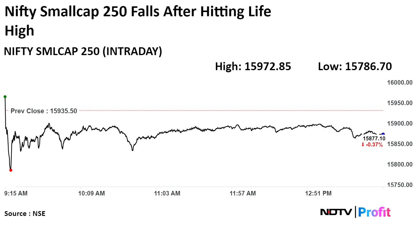 The NSE Nifty Smallcap 250 rose 0.23% to 15,972.85, the highest level since its incorporation. It erased all gains to trade 0.32% lower at 15,884.00 as of 1:55 p.m., as compared to 0.20% advance in the NSE Nifty 50 index.