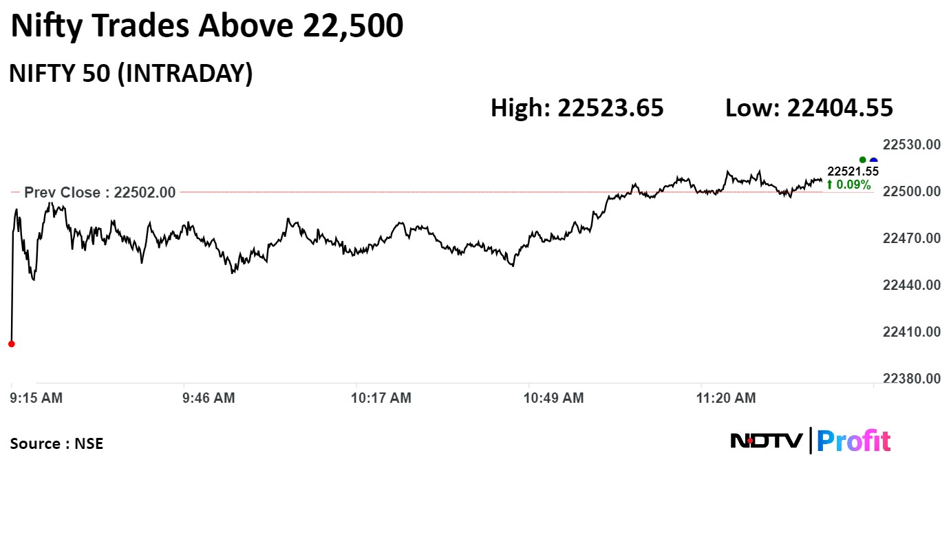 At 12:01 p.m., the NSE Nifty 50 was trading 42.00 points or 0.19% higher at 22,544.00, and the S&P BSE Sensex was 46.29 points or 0.06% up at 74,052.23. Intraday, the NSE Nifty 50 fell 0.43% to 22,404.55, and the S&P BSE Sensex fell 0.33% to 73,762.37.