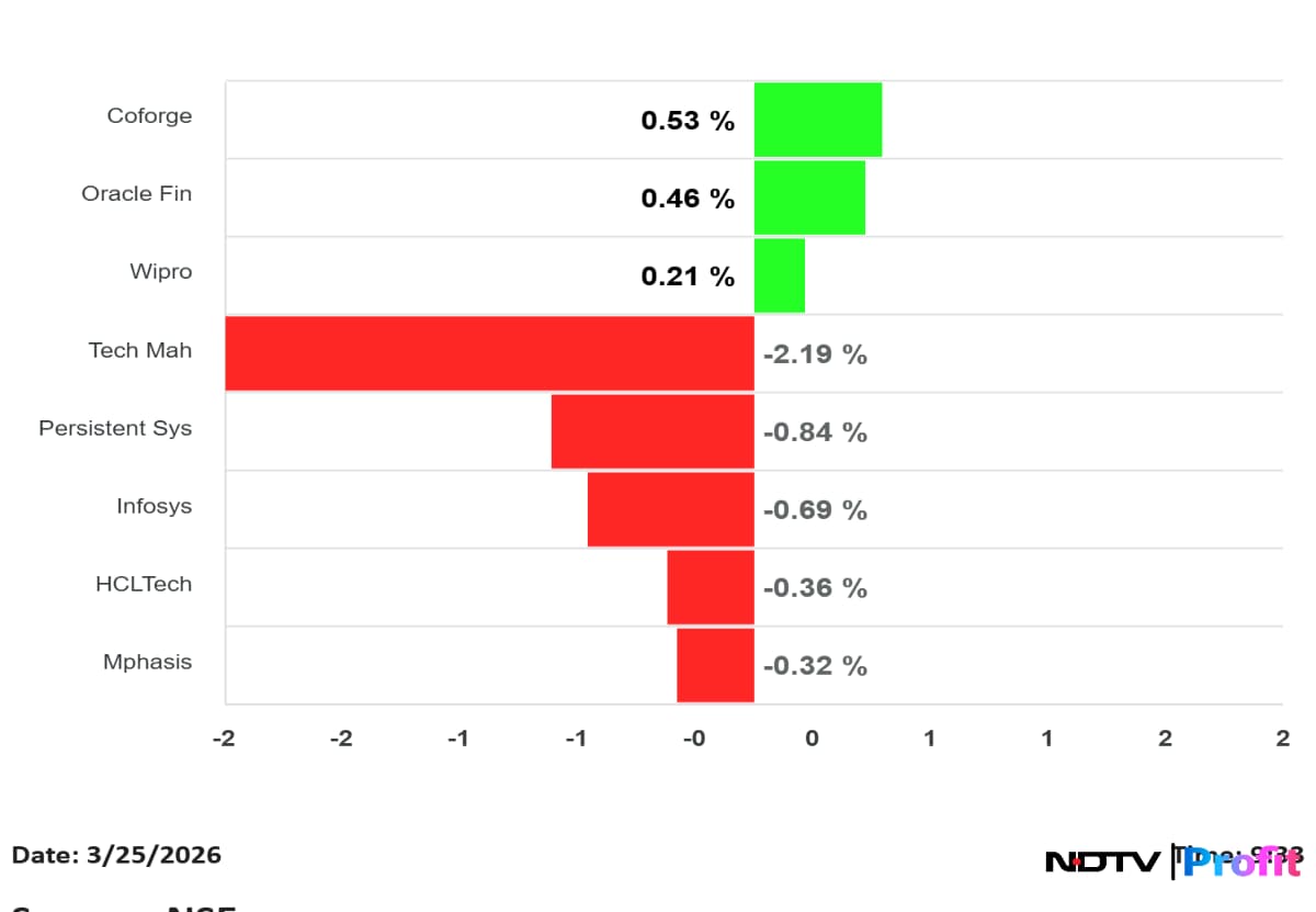 Tech Mahindra was the top drag in the index, down 2.19%. Persistent Systems fell 0.84%, Infosys declined 0.69%, HCL Tech was down 0.36% and Mphasis slipped 0.32%.