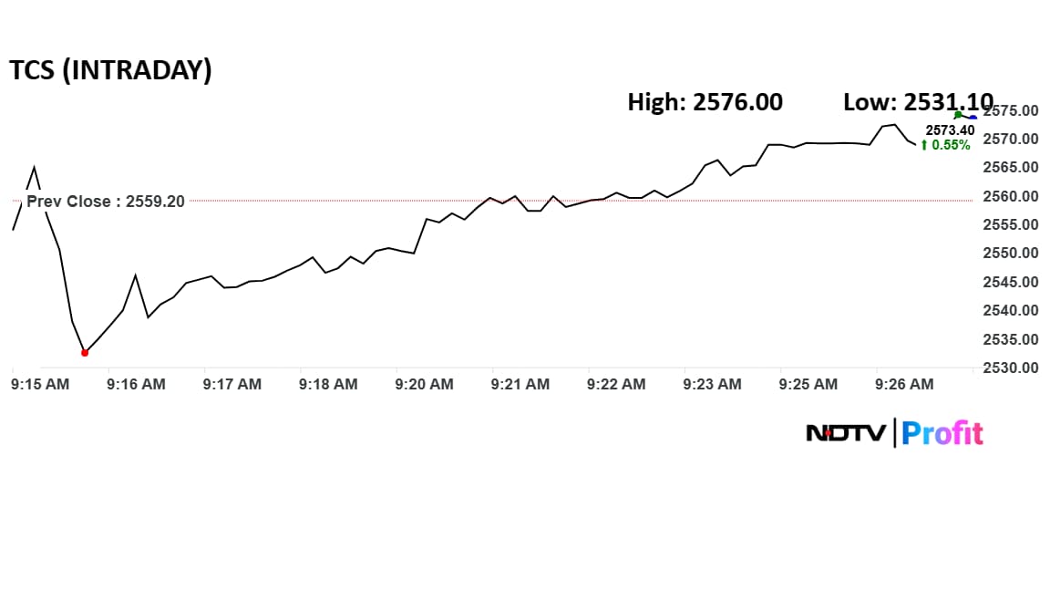 Tata Consultancy Services shares rose about 0.55% intraday to Rs 2,573.40. The stock hit a high of Rs 2,576 and a low of Rs 2,531.10 during the session.