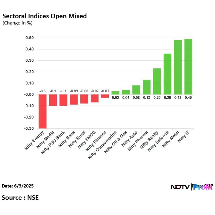 On National Stock Exchange, six sectoral indices opened higher, six opened lower, and three opened flat out of 15. The NSE Nifty IT was leading gains, and the NSE Nifty Energy was trading in losses.