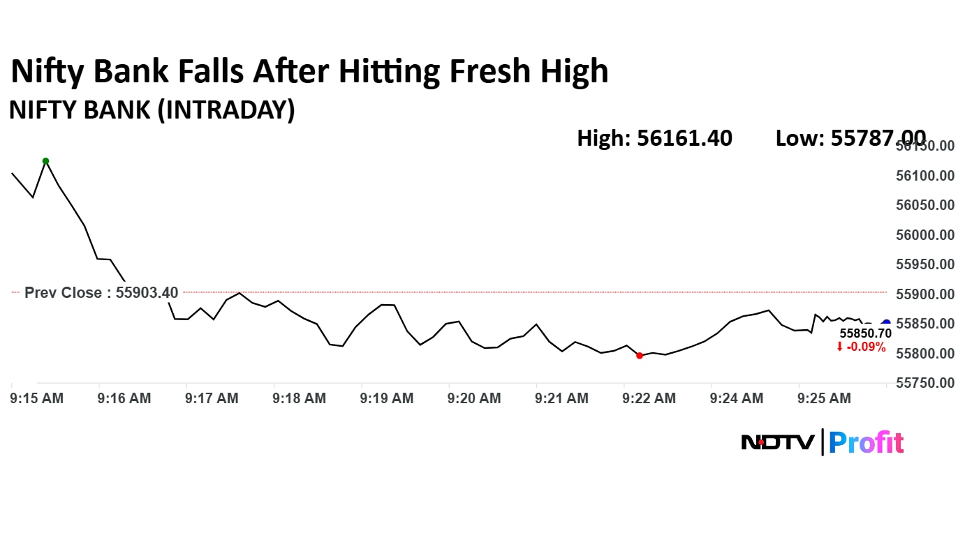The NSE Nifty Bank rose 0.52% to record high of 56,161.40 as HDFC Bank Ltd. and Federal Bank Ltd. shares led. The index quickly erased gains and was trading 0.15% down at 55,835.20 as of 9:29 a.m.